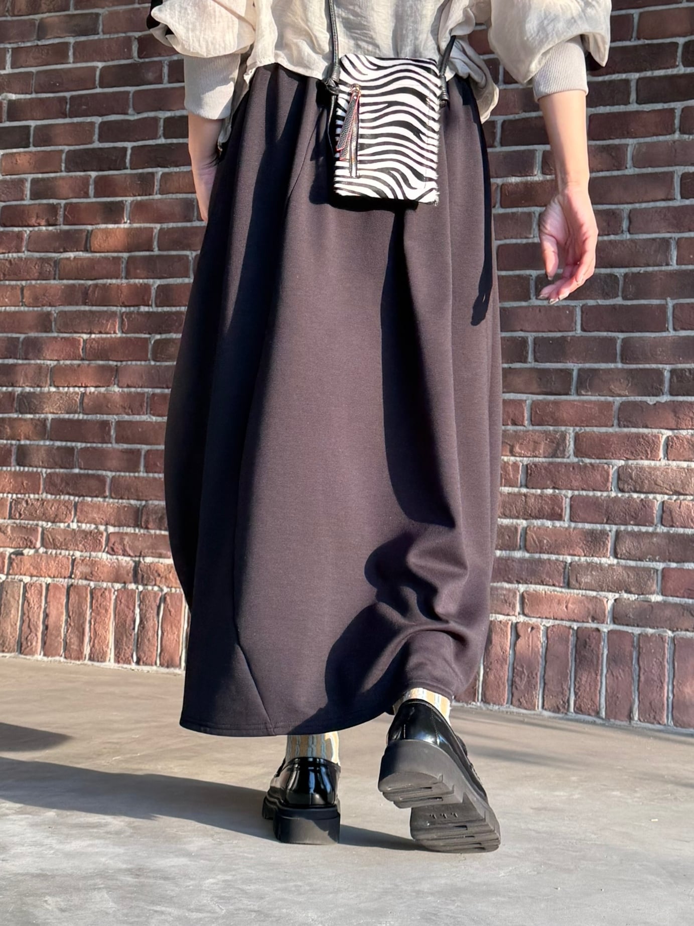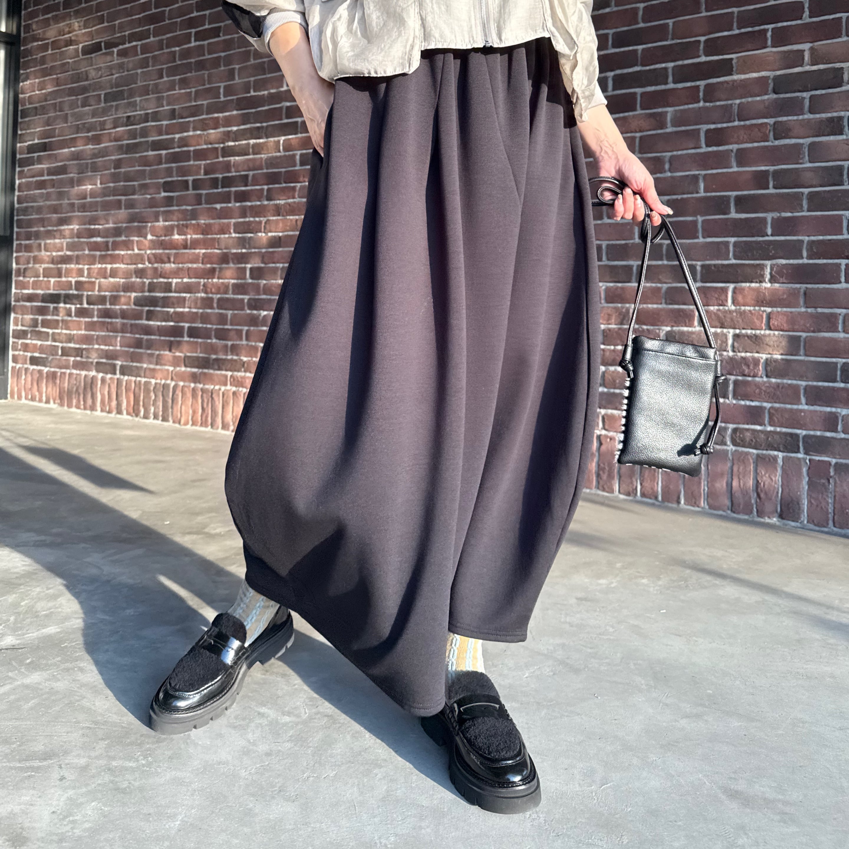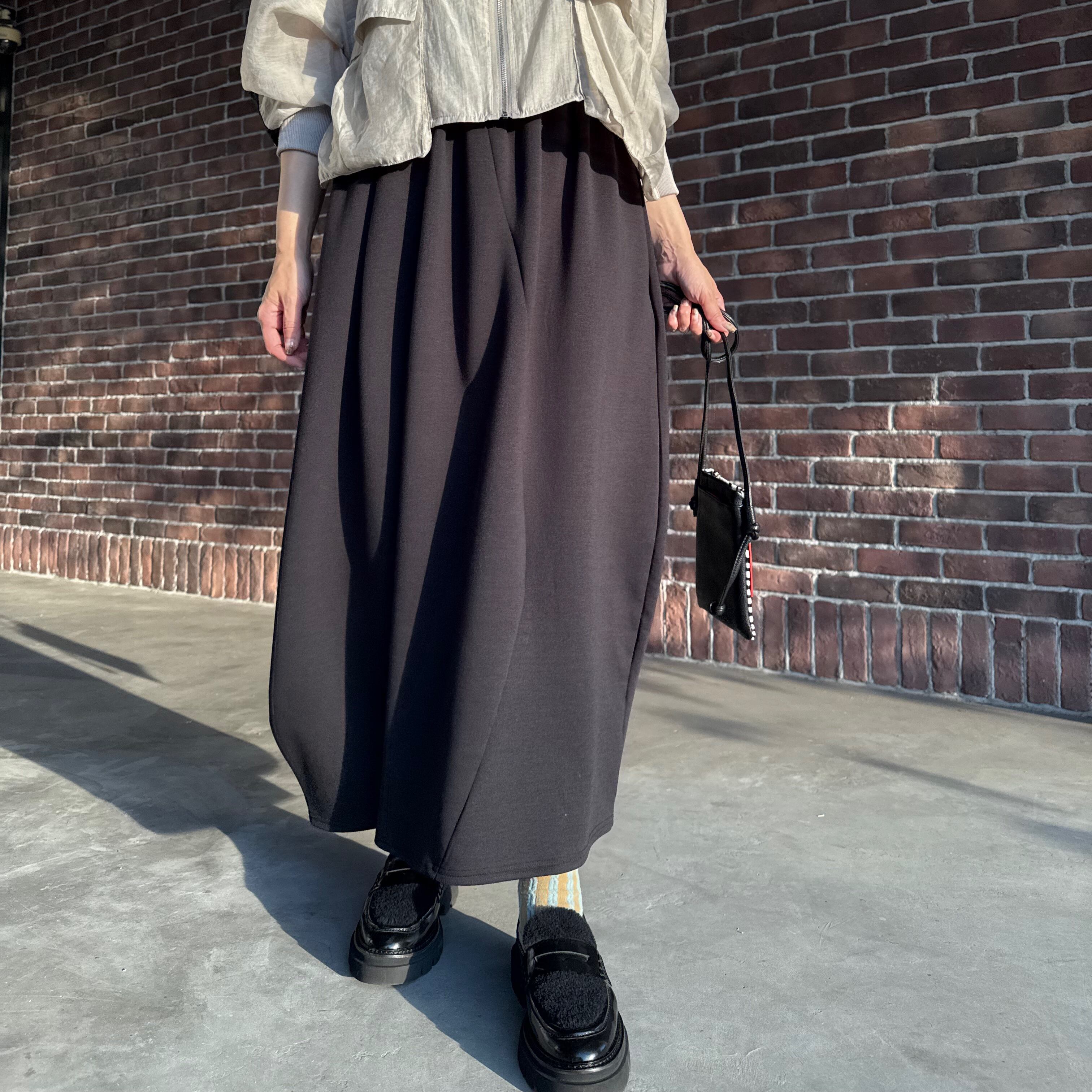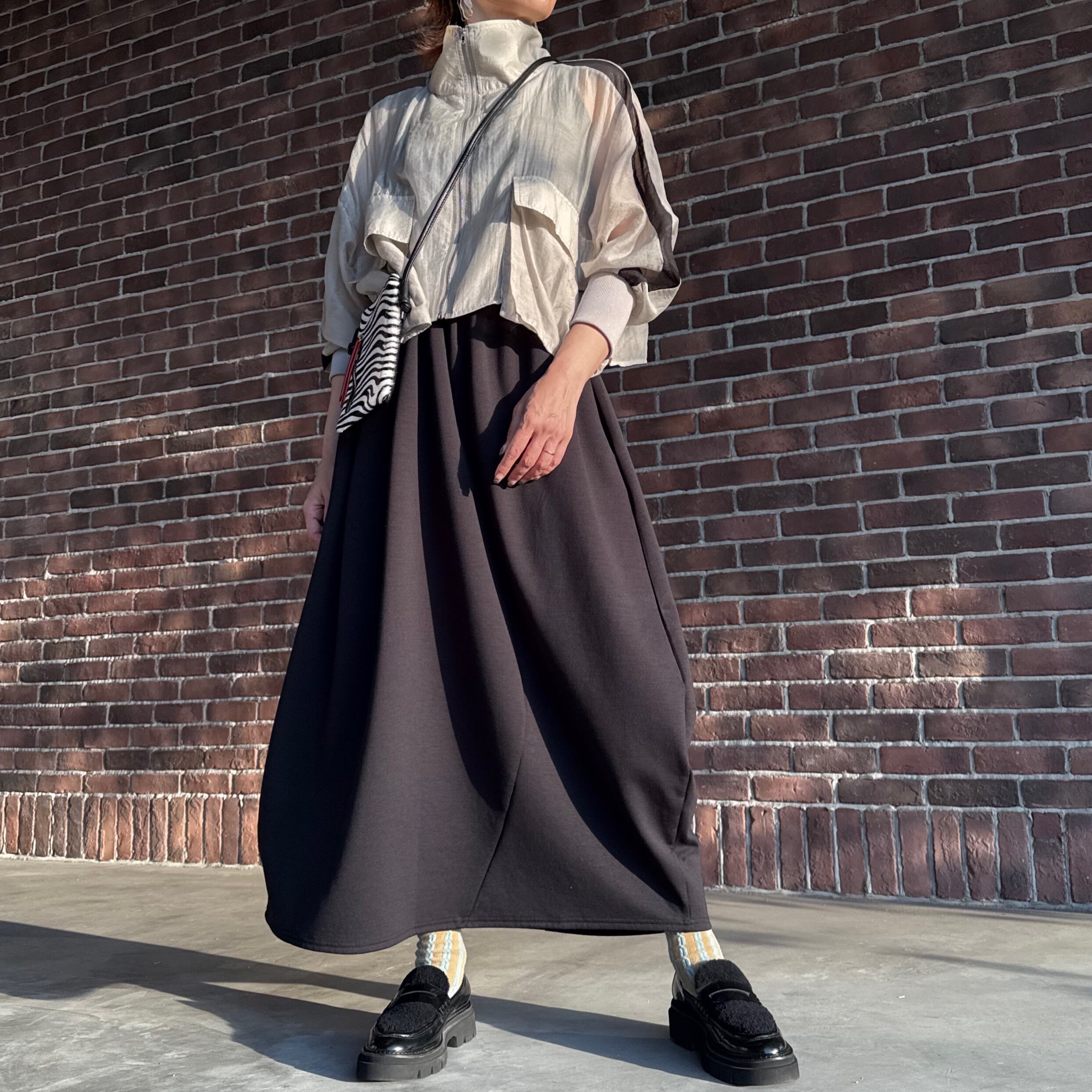 丸みのある立体フォルムが印象的なコクーンシルエットのロングスカートです。