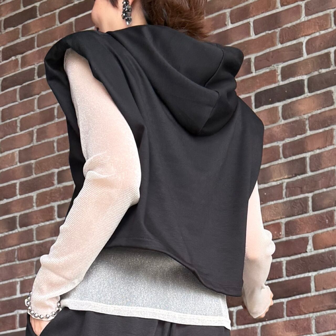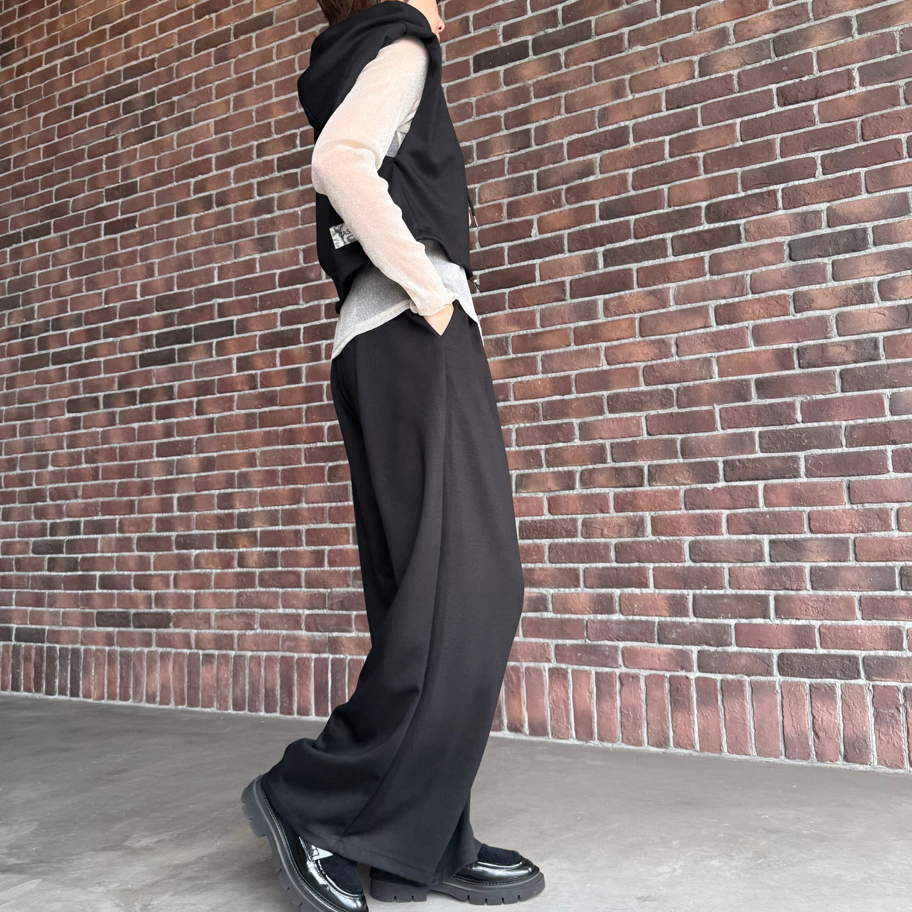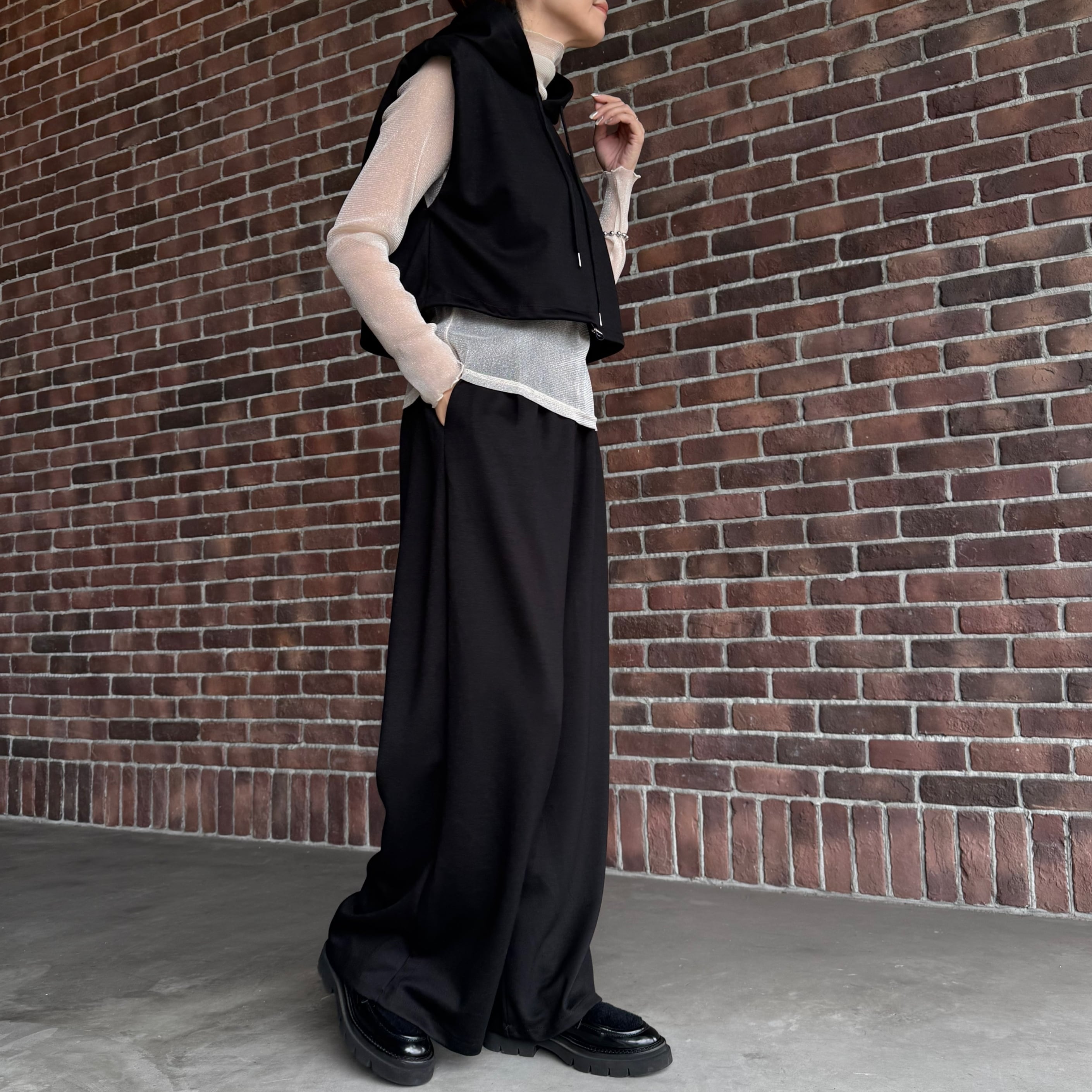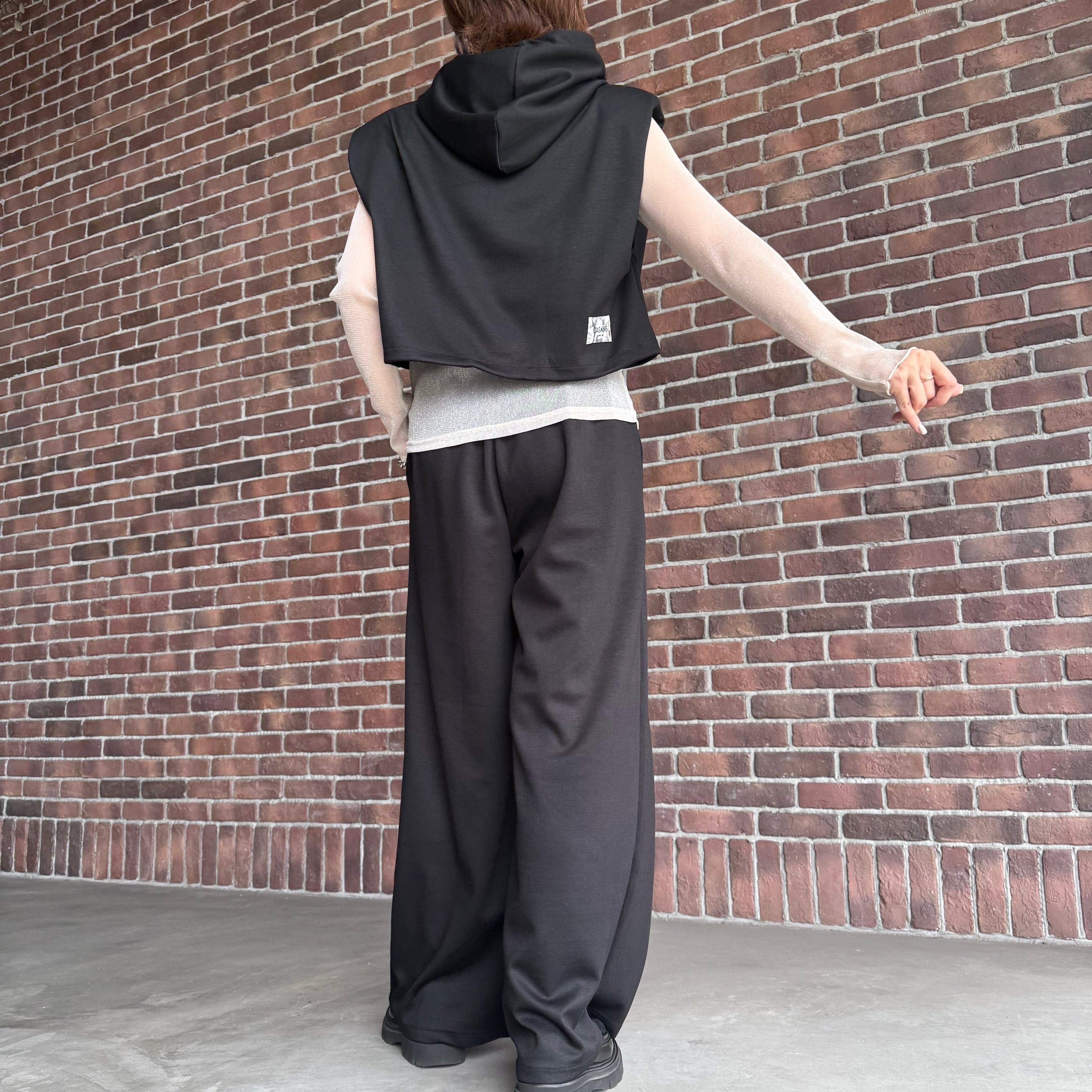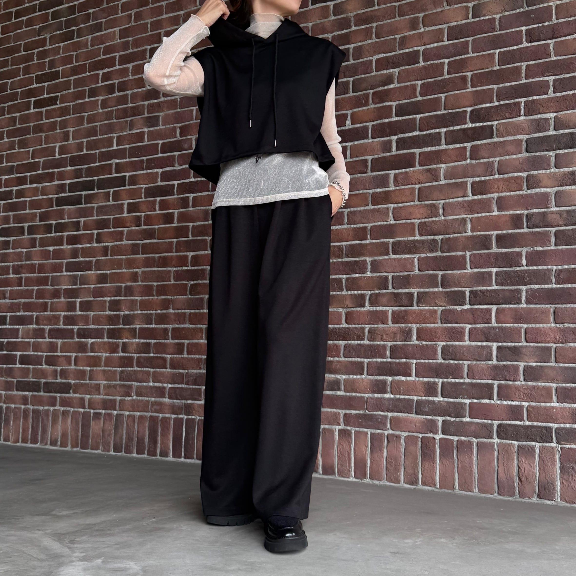 立体的なショート丈フーディと、美シルエットなワイドパンツの2点セットアップ。